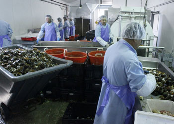 Shucks Maine Lobster of Richmond, Maine. Shucks has developed a range of lobster products for national and international markets. It is one of the few lobster processors in Maine. The predominance of the Canadian lobster processing industry has left Maine reliant on it as a buyer of the early soft shell lobster. This year Canada and Maine have had early soft shells and very high catch levels. Market saturation has impacted the range of the american lobster. ©Photo by Sam Murfitt