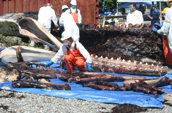 Using knives, cutters worked at separating the flesh from the bone. Chunks of flesh were piled on tarpaulins or in buckets. BMS Construction was on hand with a bulldozer to lift enormous chunks into a large rolloff. The cutters carefully dismantled the skeleton. Spectators, some holding their noses, watched from a nearby hill and pier.