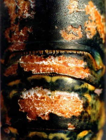 The disease is characterized by moderate to deep erosions on the carapace, which in severe cases may spread to the other parts of the lobster. Heavily affected animals literally can be covered with a rotted, weakened shell. Photo courtesy of Journal of Shellfish Research.