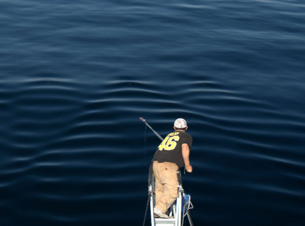Chris Weiner harpooning bluefin in the Gulf of Maine. Weiner said he’s seen a mixed season with spotty catches, good quality fish, bad weather and good prices. Things pick up on Georges in Mid October. Brian Weiner photo.