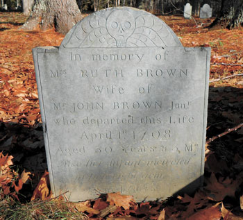 Ruth Brown died 61 years before Belfast and it's cemetery were officially established. The moving of her grave is a possibility or Ruth may have been resting in peace when the cemetery was established around her. The markings, the skull, angel wings and the stone's text are traditions dating back to the earliest colonial gravestones. The presence of the stone in the area indicates an early colonial settlement. At the head of a great bay and at the mouth of a great river, it was a likely place to settle for colonists and native Americans before them. Tom Seymour photo.