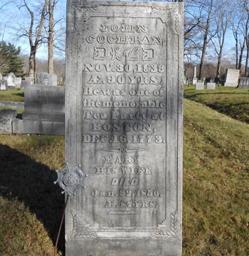 Belfast cemetery. When towns were established in the 1700's cemeteries were among the first public works projects. Churches set out their own and those were called graveyards. The American Revolutionary War service medallion lower left indicates military service. The Tea Party notation suggests early involvement in the lead up to the revolution. The medallion may also mean that Mr. Cochran was rewarded for his service with land in the Belfast area. Tom Seymour Photo