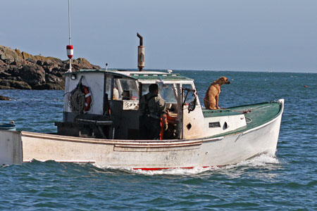 Hauling off Machais, 2010. Showing some roots to earlier days, the glassed-over wood hull, waterline length, basic wheelhouse and the stern dog are still doing the job. Older fishermen remember a lobster fishery that was very different not so long ago. A few remember back to a fishery that would not come close to supporting the big boats, fuel and equipment costs of the contemporary Maine lobster industry. That it will keep changing is certain, just how it will change is not. © Photo by Sam Murfitt.