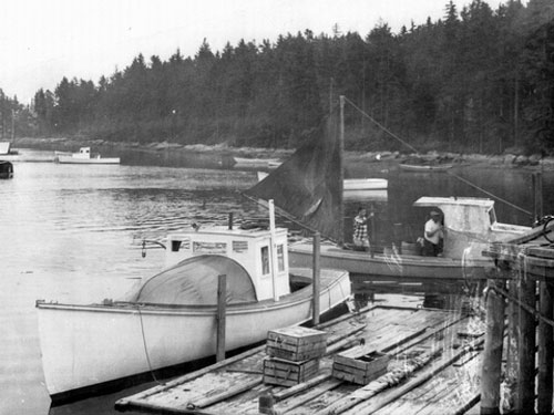 Winter Harbor wharf 1940's. Charlie Jacob’s boat with spray hood and house added, left, and the then newer all-wood top, right background. Photo Courtesy of Winter Harbor Lobster Coop.