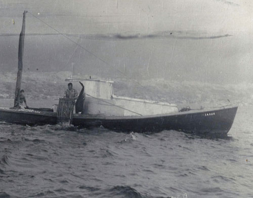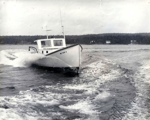 The narrow beam of Doug Torrey's Elona off Winter Harbor in the early 1950's. At 37' x 7' the ratios were closer to that of a canoe than todays wide boats with big engines. Photo Courtesy of Winter Harbor Lobster Coop.