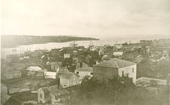 Belfast 1869. Looking east across the Pegassawsskeag River. Castine across the bay on the horizon in the distance at right. The harbor and waterfront became magnets for industry and merchants and shipbuilders thrived. By 1868, the waterfront and shoreline of the Passagassawaukeag River was lined with wharves and shipyards; 26 of the former and six of the latter. Photo courtesy Belfast Historical Society.