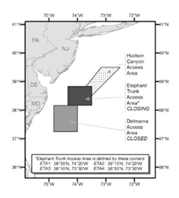 We have closed the Elephant Trunk Area (ETA) to all scallop fishing for 180 days through emergency action, from December 12, 2012, through June 10, 2013. Framework 24 and following actions will likely keep this area closed for up to another 2 years, once this action has xpired. This action was requested by the New England Fishery Management Council with the support of the scallop industry. The 2012 scallop survey saw the third highest observed abundance of small scallops in the ETA since 1979. These scallops need to be protected to allow them to grow for their future harvest. The success of the entire scallop area rotation program depends on timely openings and closing of access areas in order to protect scallop recruitment and optimize yield.