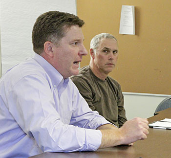DMR Commissioner Pat Keliher left and fisherman Bob Baines at the December 11 Lobster Advisory Council meeting addressing the problem of high volume low value lobster flooding the summer markets. The council passed a motion that when passed will allow the DMR to fishing limit days and time of day in the summer. © Photo by Sam Murfitt