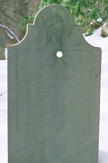 Slate stone in a remote grown over and now wooded private family graveyard near the Connecticut River. The family was among the first Europeans to settle there and among the few to survive the Indian wars of 1675 and 1704. A plain stone with images of an urn and willows, the bullet hole is presumed to be not part of the original design. The hole seems likely to have been made by musket ball, as a rifle cartridge would have made a smaller hole. Mr. Marchant who died in 1814, during another war at 98 years, would have been born not long after the most famous French and Indian raid on Deerfield, MA in 1704. Photo courtesy of W.E. Oldham