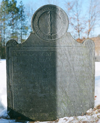 The third stone in the same rural Connecticut Valley cemetery. It has another unusually long epitaph. It too describes a tragic end and loss for the family. The loss in part measured by the near permanence of the message for succeeding generations. It reads: “In memory of Mr. Elijah Bordwell who died Janry 26th in ye 27th year of his age having but a few days survived ye fatal night when he was flung from his horse and drawn by ye stirrup 26 rods along ye path as appeared by ye place where his hat was found and where he had spent ye whole night treading ye snow in a small circle. The family he left was an aged father, a wife and 3 small children. On this side death mans dangers never cease. Beyond ye virtuous share eternal peace.” Photo courtesy of W.E. Oldham