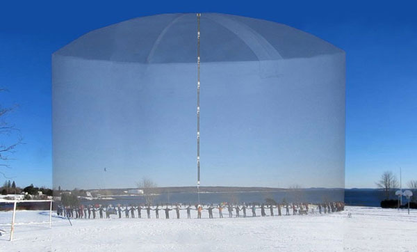 Graphic scale rendering of proposed LNG tank in Searsport, Maine. Local opponents of the project form the base circumference of the tank. The tank would be built on an island near existing liquid fuel tanks.