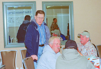 Spiros Tourkakais, East Coast Lobster, (standing) talking with fishermen following a panel discussion of lobster pricing at the Mass. Lobstermen’s Assoc. meeting January 25, 2013. Seated right is Berie Feeney MLA member who moderated the panel discussion. Spiros summarized his view by saying, “this is our problem, dealers and fishermen. We have many ideas, but we have to organize to find solutions and lobby for changes.” Fishermen’s Voice Photo