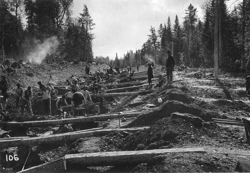The photo may have been taken by Moses Burpee, the road’s chief engineer and surveyor. Surveying a right-of-way through forested “wildlands” before the day of topographical maps was no small achievement. The seemingly primitive spectacle of building a railroad by muscle power and blasting powder (dynamite, actually; two steam diggers were also employed) was, in fact, a thoroughly familiar process. By 1900 American contractors had built well over 200,000 miles of trackage in this country, as well as many foreign roads.