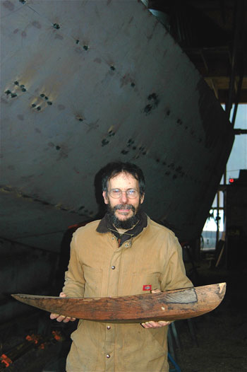 David Stimson holding the half model on which the full sized vessel is built. Stimson and his family have built boats at their Boothbay shop for thirty years. New neighbors claim they didn’t know Stimson was building boats when they bought the property and have been attempting to force Stimson to close down. Steve Cartwright Photo