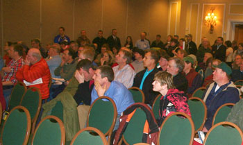 Folks lean in to hear Governor Paul LePage express his commitment to boosting the lobster industry, at the Maine Lobstermen’s Association’s annual meeting last month. Laurie Schreiber Photo