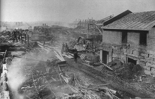 The tannery whistle is blowing the signal of fire, and the tannery is all in flames. 1.30 A.M., tannery burned… It is a beautiful moonlight night, calm and warm, no wind and what there is comes from the northeast. Everything is favorable for a fire of this kind at this place. Carload of leather on tracks saved. No bark burned, many hides removed. Cause of fire unknown. James McHugh and Peter Whalen night watch. When whistle blowed tannery was in flames…