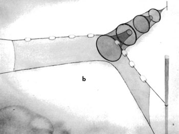 Fyke net used to harvest elvers. The net is allowed to span only a part of the area where a stream enters a marine estuary. NOAA Graphic
