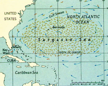The only sea without a coastline, the Saragasso Sea is an area of the Atlantic Ocean with large amounts of a saragassum seaweed on the surface. The sea is bounded by ocean currents. NOAA Map