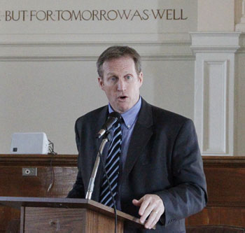 Eric Schwaab, former NE Regional Asst. Adminstrator doing damage control in Gloucester during the NMFS enforcement scandal in 2011. Excessive fines were levied on fishermen. Enforcement’s spending collected fine money on luxury boats, cars, and travel opened the agency to scrutiny. Schwaab soon moved over to another department job. © Photo by Sam Murfitt