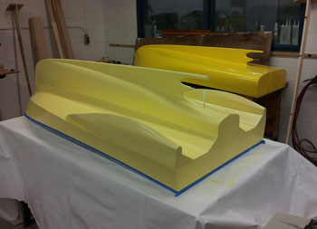 Trimaran hull in foreground and conventional lobster boat hull near completion at Maine Maritime Academy. Students built the hulls during the 2012-13 school year. The trimaran hull is expected to reduce fuel use by 25%+ while retaining the above the waterline appearance of the traditional lobsterboat. Doug Read Photo