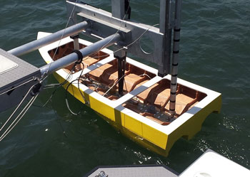 The Maine Maritime Academy trimaran lobster boat hull being tested in San Diego Bay, California. The 7-foot model is fully instrumented for collecting performance data in real sea conditions. The model is attached to a 24' sea testing vessel. Doug Read Photo