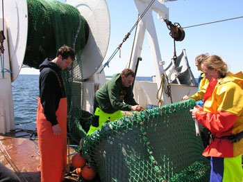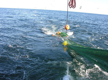 Experimental net being set from SMAST vessel. A test of the video technology on Atlantic yellowtail flounder showed potential to greatly increase data collection compared to conventional methods. Photo courtesy of SMAST