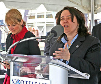 Rep. Ann-Margarette Ferrante, right, spoke at the announcement of Massachusetts Attorney General Martha Coakley’s (left) law suit charging NOAA with imposing excessive fishing quota cuts. The 78% quota cuts, said Ferrante, are nearly double the New England Fishery Management Council’s almost unanamous vote for an interim cut of 40%. Ferrante called the NOAA cuts a vindictive attack on fishermen who months earlier called for accountability from NOAA for enforcement excesses. © Photo by Sam Murfitt