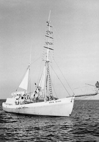 View of the Irene and Alton deck from the top mast. Lower center is Bernard Raynes (white top of hat), other crewmen seen on deck with Paul Molyneaux leaning over starboard side. They are hauling in line with harpooned swordfish. As the boat rolled from port to starboard and back a man in the topmast could be flung overboard. Bernard Raynes photo
