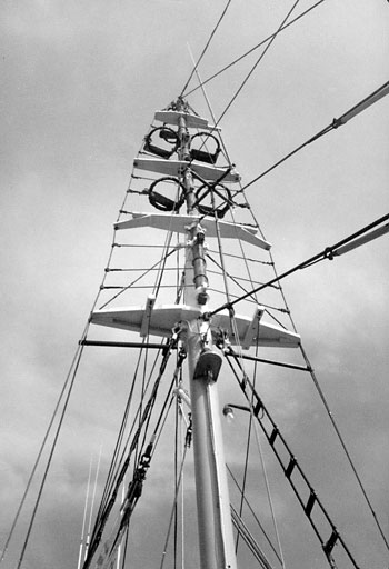 The mast of the Irene and Alton rigged for sword spotters. Crewmen climbed into the rigging and stood in the crosstrees on boards with their waists in the hoops to keep from being thrown off as the boat yawed. Sword season is late summer, and although the weather is often good, the days are long, especially in the crosstrees. Bernard Raynes photo