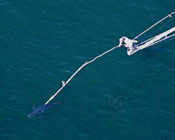 Harpooning blue fin off tuna Rhode Island. Harpoon fishermen have the advantage of selectivity among a pod of tuna. Wayne Davis photo, wayne@oceanaerials.com