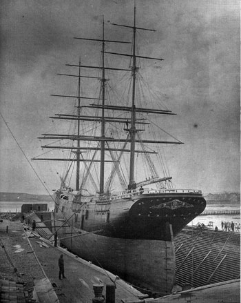 The full-rigged ship St. John Smith in dry dock at Knightville, Cape Elizabeth (now South Portland), May 1874. Newly built at Kennebunkport, the Smith has been towed to Portland to be “copper” sheathed. The local press customarily described every new vessel as being the most wonderful nautical advancement since the ark: