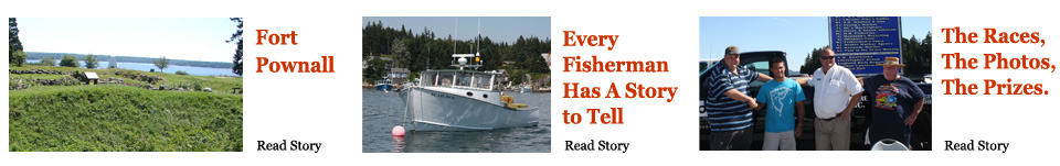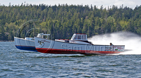 “Air Alley” at the Winter Harbor Lobster Boat Races on August 10, 2013. Galen Alley’s Foolish Pleasure skimming over swells on the last few feet of its flat aft section. Alley reached 75 MPH at Winter Harbor in less than ideal surface conditions for the light hull. He topped that with a record-breaking 77.4 MPH run in Pemaquid the following day. © Photo by Sam Murfitt