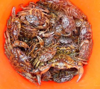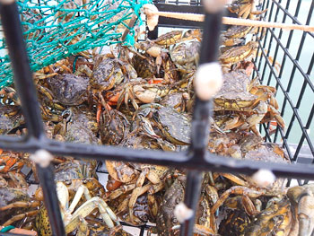 Green crabs from Berry Cove mob a trap during a recent census. Laurie Schreiber photo