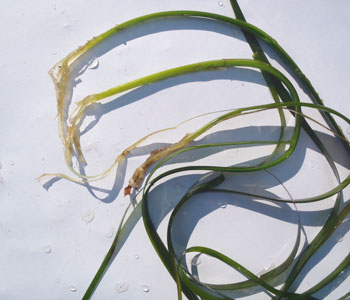 Eelgrass with damaged root stocks. Upper Frenchmen’s Bay lost 66 percent of its eelgrass between 1996 and 2008, and lost everything that was left over the past year. The incidence of eelgrass and crabs is being monitored. Laurie Schreiber photo
