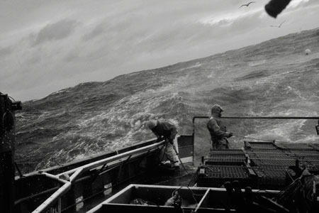 The 92' F/V Carol Coles out of Portsmouth, NH. Winter season 2010 in the deep water of George’s Basin, north of George’s Bank. The Carol Cole was an Area 3 lobster and crab boat, whose average trip length was 10 days. It’s crew were Joel Woods of Portland, Maine, Dennis Polluk of South Portland, Maine, Roger Raymond of Saco, Maine and Justin Dunphey of Damariscotta, Maine. Joel Woods photo