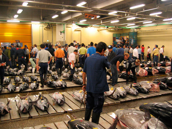 The end of the tuna auction at the Tsukiji Fish Market in downtown Tokyo, Japan. Japan is the largest wholesale fish market in the world.