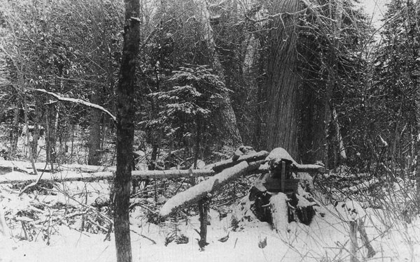 A deadfall trap, near Houlton, about 1890. Note the large, clear cedar beyond—shingles were long Aroostook’s main cash crop. Charles West, of Houlton, wrote about trapping with deadfalls—indeed, this is likely his trap: