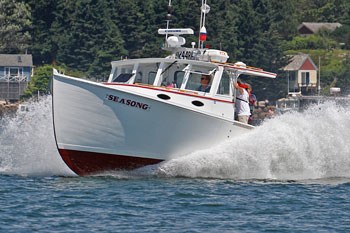Frank Gotwals racing his recently launched Seasong at Stonington, Maine 2013. Gotwals runs a Cummins QSL9 which delivers 405 HP at 2100 RPM. Seasong is Gotwals’ third wood lobster boat. He helped build the last two with Peter Buxton. © Photo by Sam Murfitt