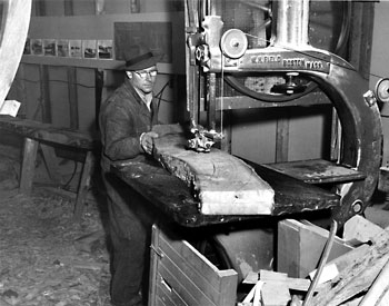 Roger Rich sawing frames for a 17th century reproduction shallop in 1956. Rich & Grindle built the shallop for the Mayflower project in Plymouth, Massachusetts. Photographer unknown. Courtesy The Southwest Harbor Public Library Digital Reference Archive/Plimoth Plantation.