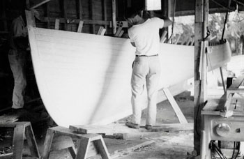 In the foreground, Ralph Grindle at work in the Rich & Grindle Boatbuilding shop in Roger Rich’s barn at 48 Clark Point Road, Southwest Harbor. Courtesy Southwest Harbor Public Library Digital Reference Archive.