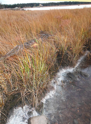 Shoreline of Jordan Bay, Nova Scotia. The white substance in the photo appeared along the shore after finfish feed lots were installed in the bay. Sindy Horncastle photo