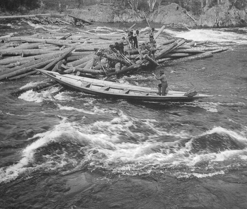 River drivers, armed with pick-poles and peaveys, struggle to uncover the “key log” of a “center” jam of spruce; centers built up over an undersucked log. On the Wassataquoik, “wing” jams, formed from the bank, served a good purpose by concentrating the “driving pitch” of water. Seventy or eighty men would be employed “picking the rear” of the drive, freeing the logs caught in the wings.