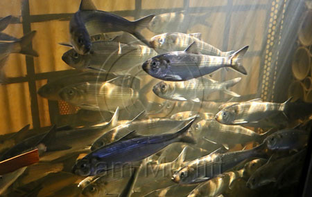 Alewives passing the viewing window at the Benton Dam fish ladder on the Sabasticook River, near Waterville, Maine. State and private groups have been attempting to restore ancient alewife access by building fish ladders at dams. Millions of alewives travel upstream every spring to spawn in thousands of lakes and ponds. For centuries alewives have been a food fish for humans, a bait fish for lobstermen and an important forage fish in the Gulf of Maine. © Photo by Sam Murfitt