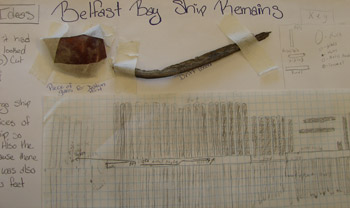 Some of the data collected and recorded about the ship in the river mud in Belfast. A sketch of the vessels ribs below. A piece of glass left and a metal nail right recovered from the vessels remains. Tom Seymour photo