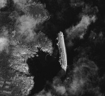 The cruise ship Costa Concordia ran aground on the night of January 13, 2012 off the Tuscan coast of Italy. It pitched over on its side leaving 32 dead and 64 injured. The white line in the water is likely a device used to help contain spilled oil and fuel. NASA photo