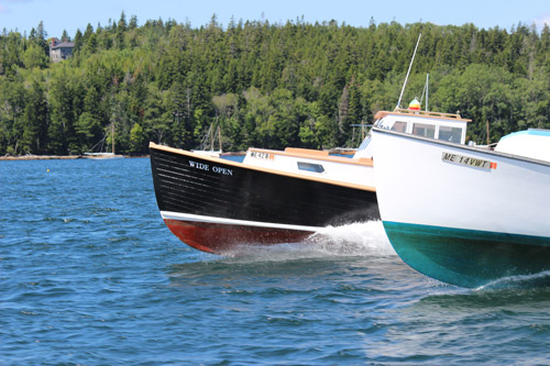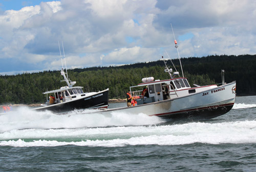 The wooden boat Wide Open in the lead at Winter Harbor. Two fast working lobster boats that like to race and do it well. Fishermen's Voice photo