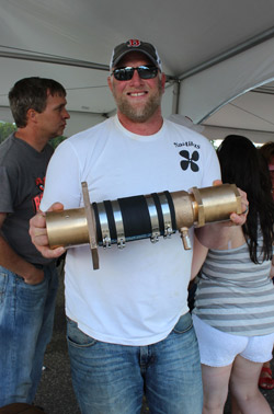Dana Beal holding the prize he won at the Winter Harbor Races. It is an RE Thomas Marine Hardware All-In-One Intermediate Shaft Bearing/Self-Aligning Shaft Seal. Designed for soft mounted engines, especially when distance from the inside seal-to-shaft coupling is at a minimum. The 2 ½ shaft All-In-One, contributed by RE Thomas Marine Hardware, is valued at $2,049. Fishermen's Voice photo