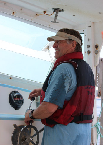 Andy Johnson lining up Whistlin’ Dixie, his Holland 40 for a race August 10, 2014. “Ahhh, I love that power!” said Johnson. Which might explain the 700HP CAT under the deck which he was about to unleash for a high speed run up the Pemaquid course. Fishermen's Voice photo Fishermen's Voice photo