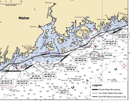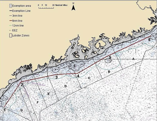 The six-mile line is a line connecting the following points (Machias Seal to Isle of Shoals). 44° 31.98 N. lat., 67° 9.72 W. long (Machias Seal), 44° 3.42 N. lat., 68° 10.26 W. long. (Mount Desert Island), 43° 40.98 N. lat., 68° 48.84 W. long, (Matinicus), 43° 39.24 N. lat., 69° 18.54 W. long. (Monhegan), 43° 29.4 N. lat., 70° 5.88 W. long. (Casco Bay), 42° 55.38 N. lat., 70° 28.68 W. long. (Isle of Shoals).