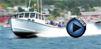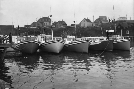 Five of the many lobster boats converted for tuna fishing at Cape St. Mary’s, Digby County, Nova Scotia 1971. To accommodate International Tuna Cup Match sports fishermen, lobstermen added fishing chairs made of pipe and plank to their boats. A few added makeshift flying bridges. Red Boutilier Collection; Penobscot Marine Museum, Searsport, Maine photo
